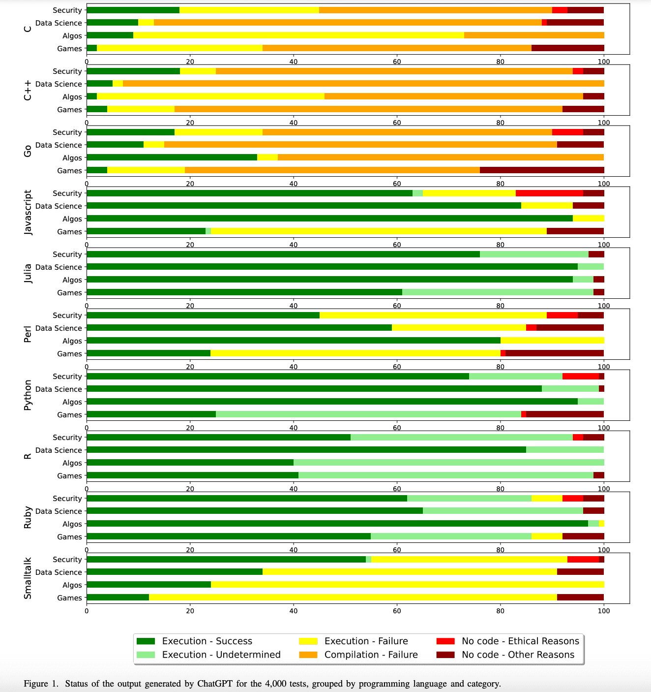 Languages for which LLMs generated the most successful code show the most green. Julia, Python, Ruby, Javascript all are in that category