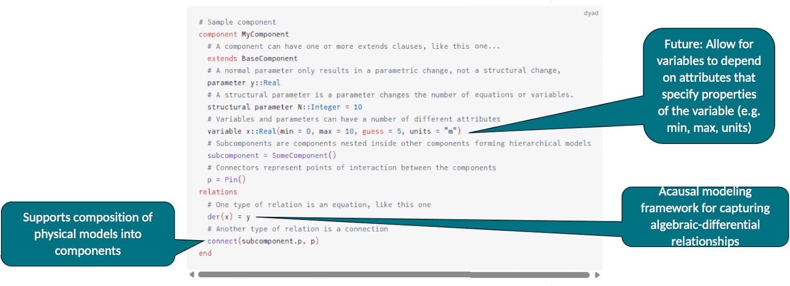 But one that also aligns with the tenets of what’s required for a highly efficient system for agentic AI. It is a very terse declarative language: you only write the physical equations, you don’t specify anything about how the computation is done. The computational realization is achieved entirely by the compiler. This level of terseness surpasses that of standard languages, achieving the main criterion required for LLM accuracy. At the same time, Dyad’s equation-based form enables strong static guarantees at compile time. And since equations comprise elements like units, variable types, and other factors, the compiler can ensure that all equations satisfy unit analysis, that only like-variables are connected, etc. to ensure that only physically-realizable equations are compilable. This satisfies the second tenet of the agentic AI accuracy: rapid and comprehensive feedback from the compiler about all things that could be going wrong.