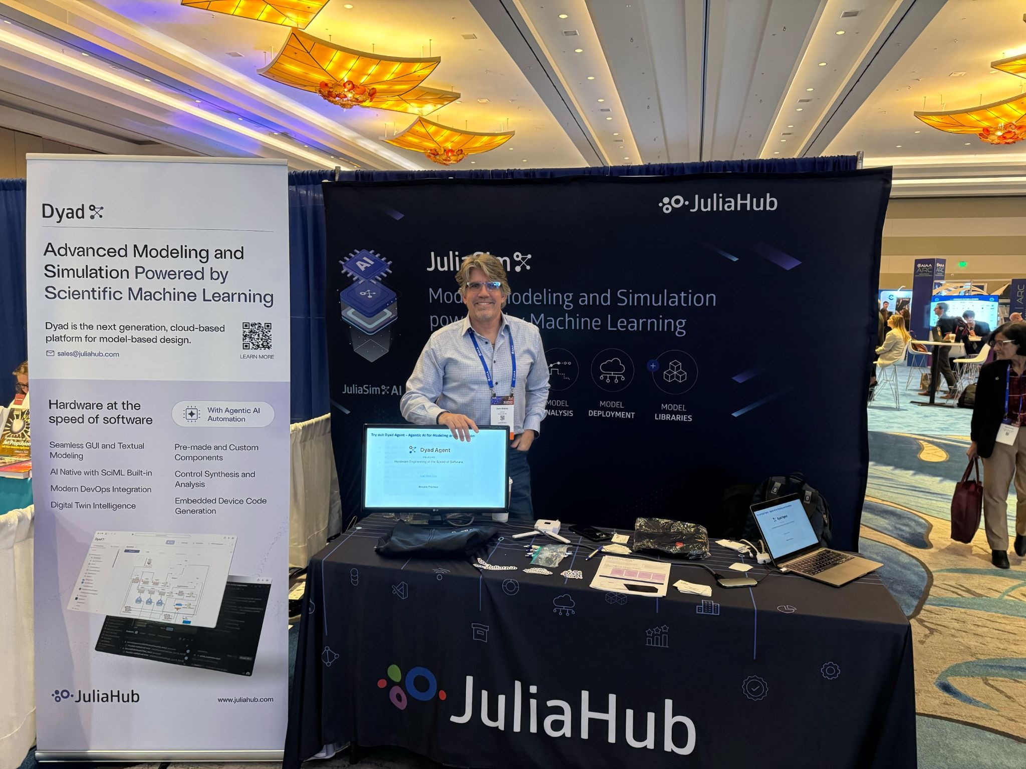 The consistent footfall at the JuliaHub booth reflects a growing interest in Scientific Machine Learning (SciML) and AI systems that work with physics-based models rather than replacing them. Many conversations were centered on how Dyad fits into existing engineering workflows and how organizations can move from experimentation to deployment.