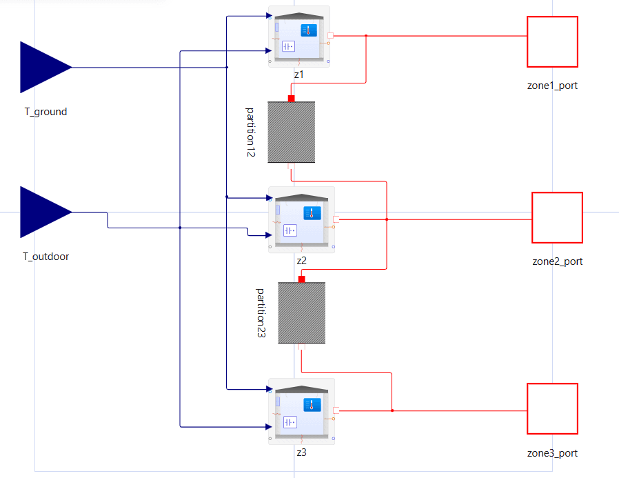 External zone ports — each zone exposes a single thermal Node port for connecting any combination of HVAC equipment, internal gains, and solar loads. The building model is agnostic to the control law; heating/cooling sources are attached at the test-harness level.