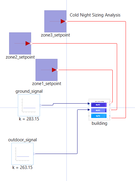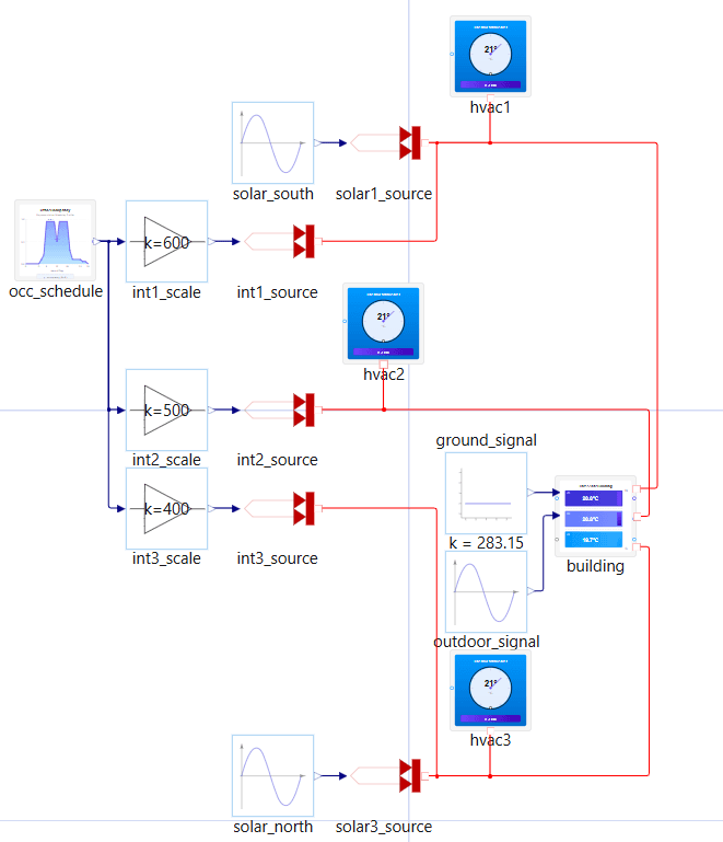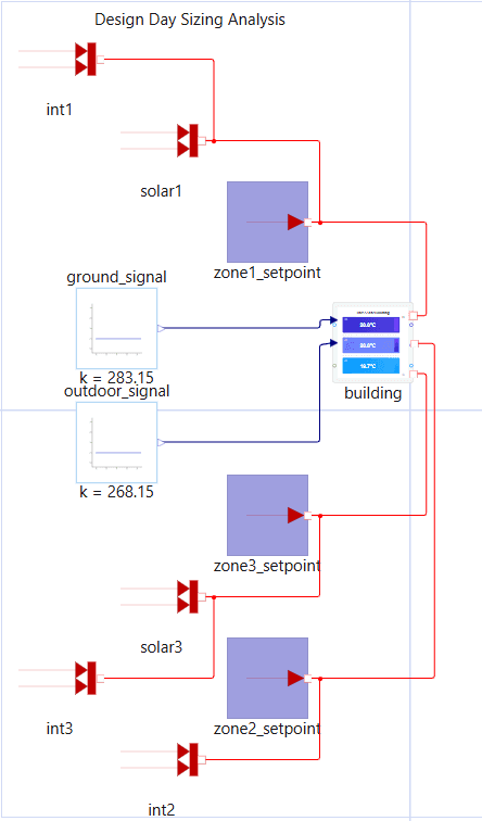 This post demonstrates an alternative: a single acausal thermal model of a three-zone commercial office building in Dyad, which is run in steady state as well as transient modes. The steady state model computes sizing of the HVAC equipment, subject to fixed boundary conditions, and the transient analysis analyzes building performance over a 24-hour diurnal operation. The base model has identical parameters and governing equations in both cases.