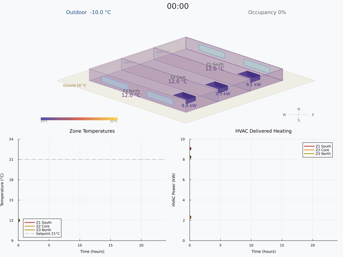 TestColdNightSizing — unoccupied cold-night conditions (outdoor: −10°C, ground: 10°C) with zero internal and solar gains. Same FixedTemperature setpoints at 21°C. This captures the worst-case heating demand that occurs at the coldest hour with no solar or occupancy offset.
