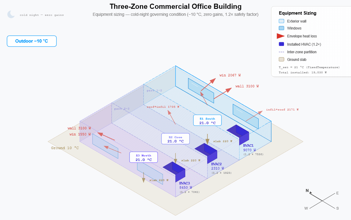 This dual-condition approach reveals that a south-facing zone sized only for the occupied design day would be undersized for cold-night operation. At −5°C with 1,500 W of solar gain, Z1 requires only 4,274 W — but at −10°C with zero solar, the same zone requires 7,558 W. The 1,500 W solar credit that reduces the design-day load vanishes entirely at night, and the 5 K colder outdoor temperature increases envelope losses by 30%. Both conditions are evaluated on the identical thermal network, with only the boundary conditions differing between the two SteadyStateAnalysis invocations.