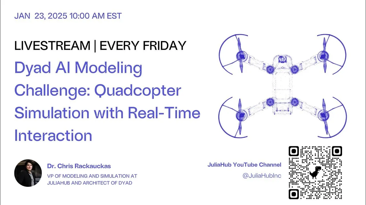 In this recorded live session, we explore how to use Dyad’s agentic AI to build and simulate a quadcopter model with real-time interaction using Makie.jl.