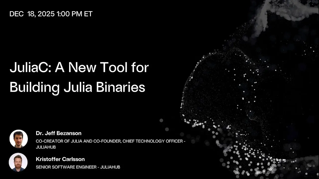 Join Dr. Jeff Bezanson, co-creator of Julia and core developer of JuliaC, and Kristoffer Carlsson, senior software engineer at JuliaHub as they introduce the new compiler interface and demonstrates how to build compact executables and shared libraries directly from Julia code. Learn how JuliaC simplifies cross-language integration, enabling you to call Julia from C, C++, Python, and other environments—and makes it easier to deploy lightweight binaries across devices and embedded systems.